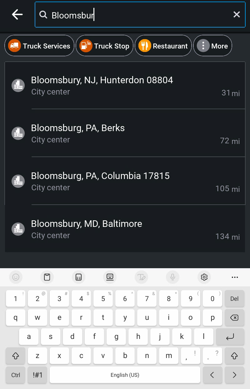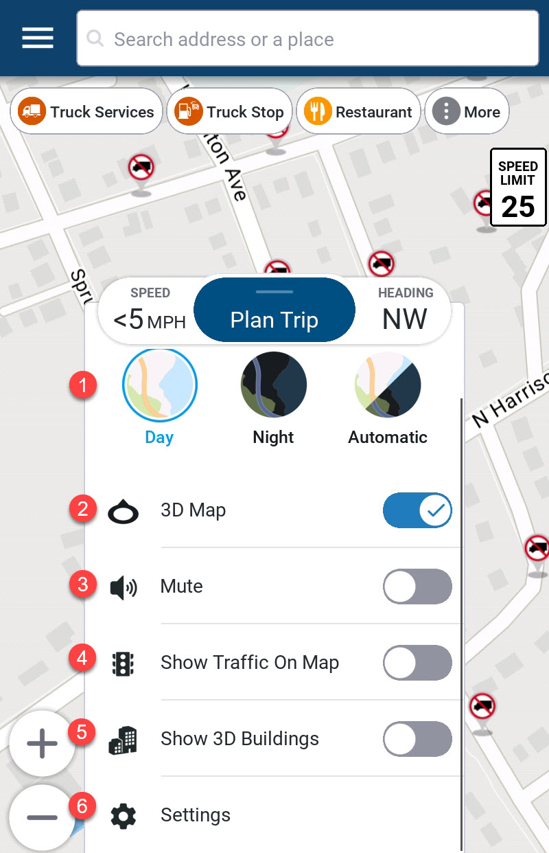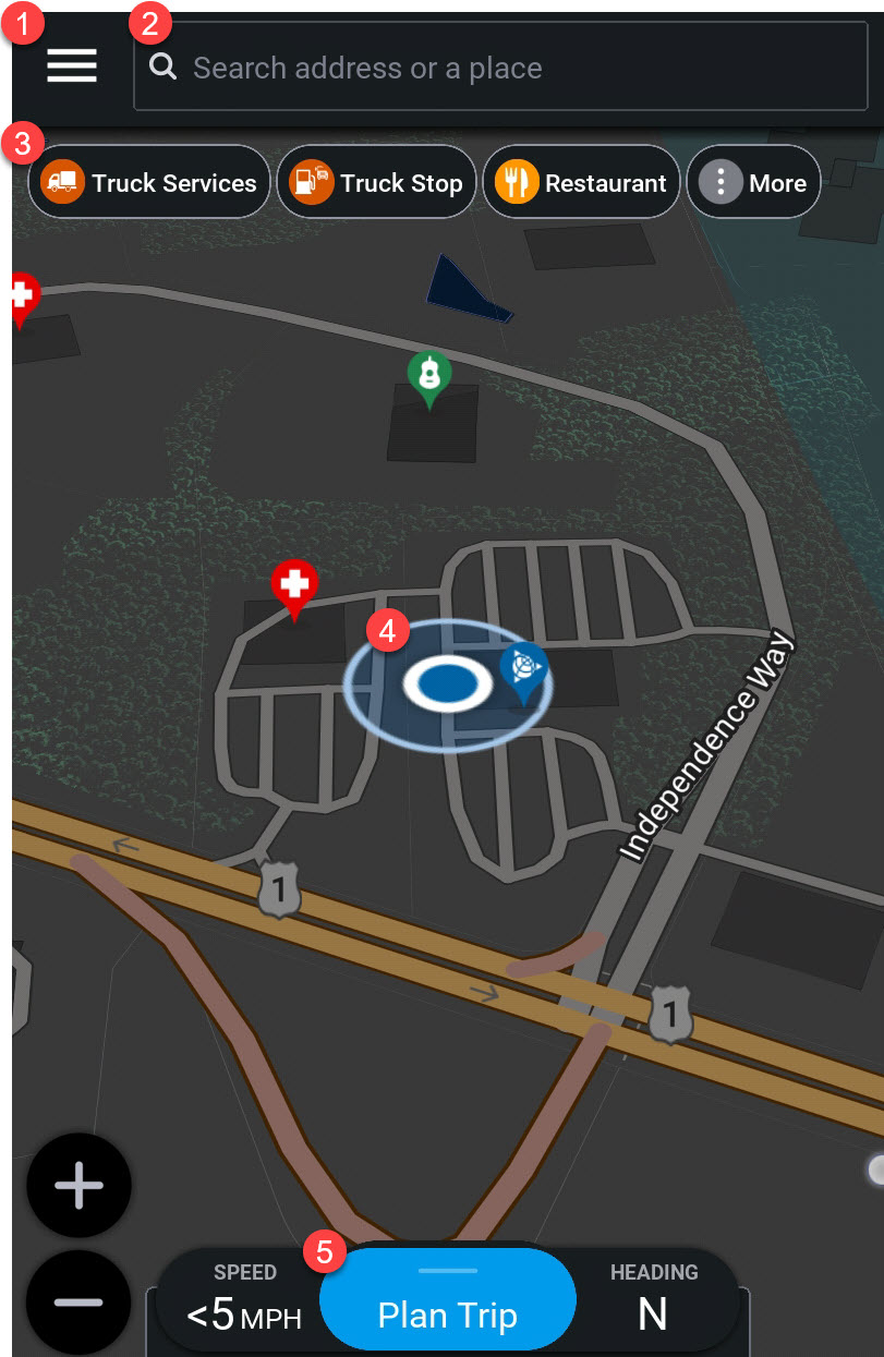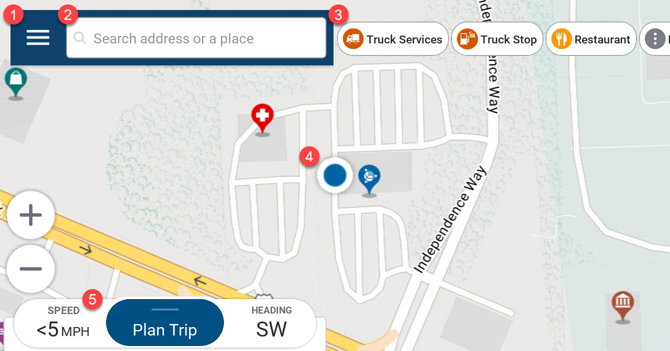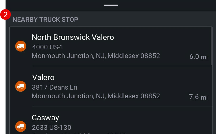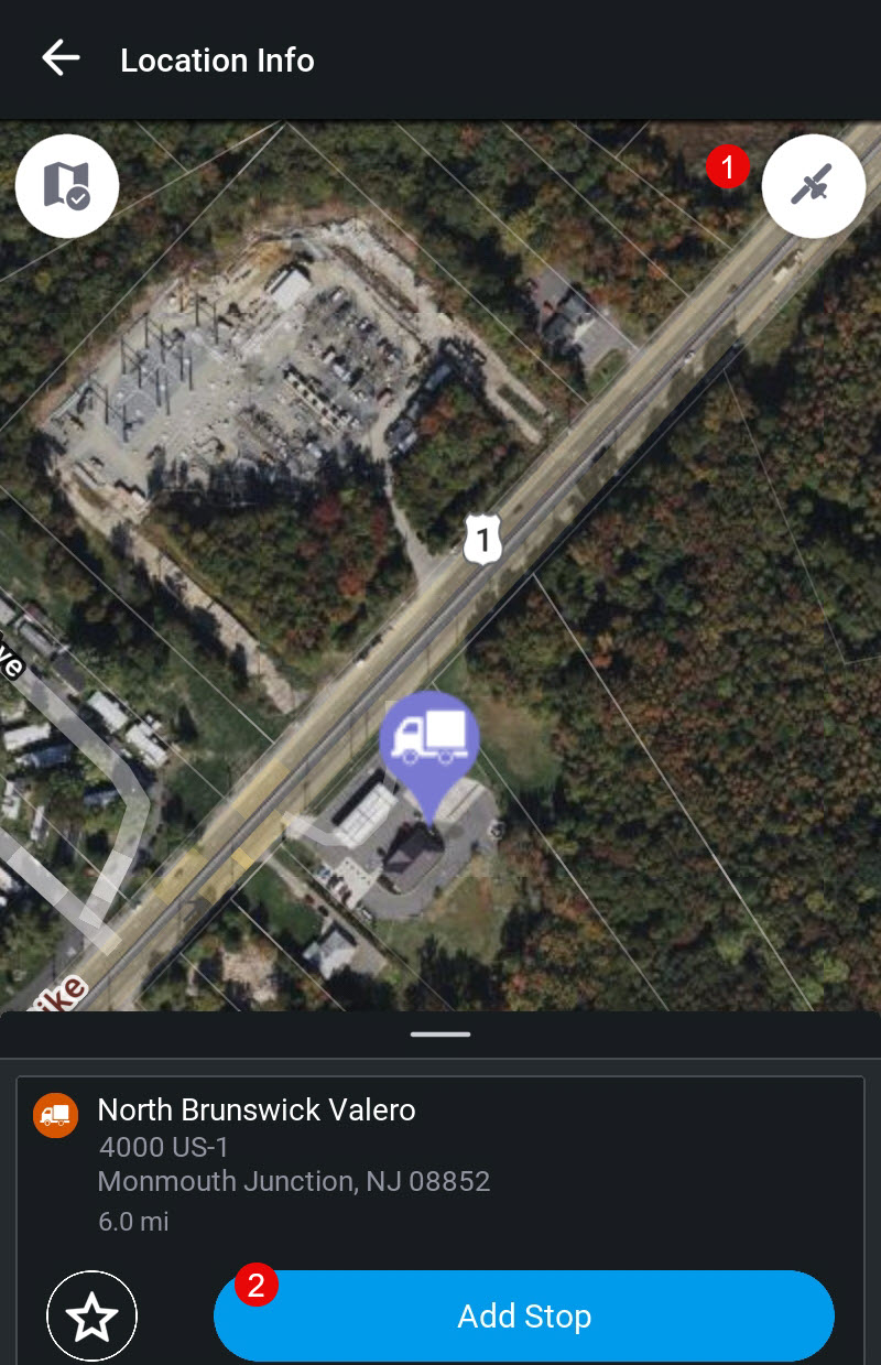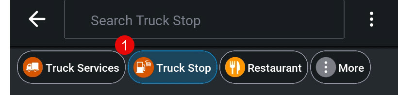 Suchen Sie nach einem Ort oder Adresse in der Nähe nach Kategorie (Truck Services, Truck Stop, Restaurant und mehr) und fügen Sie ihn als Zwischenstopp zu Ihrer Route hinzu.