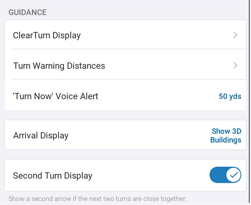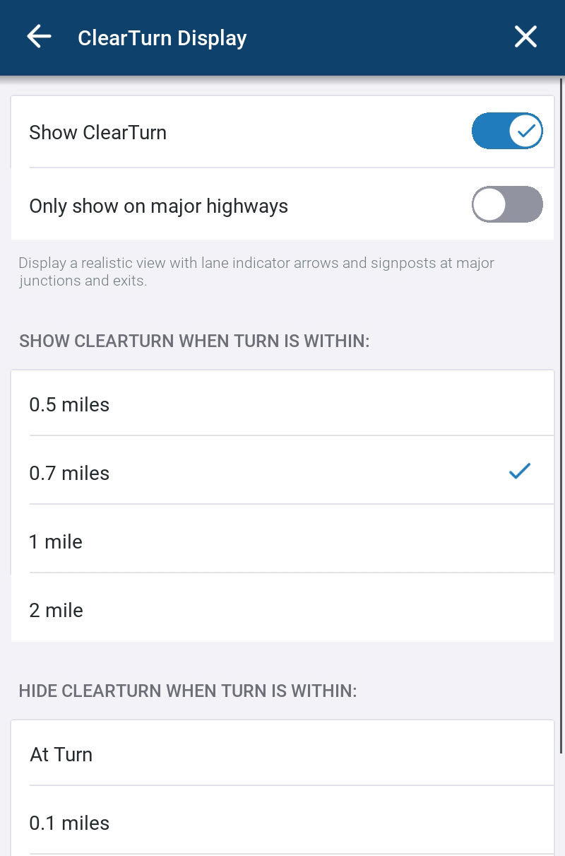 4. Sie können die Entfernung von der Abbiegung festlegen, die ClearTurn anzeigt und anschließend ausblendet. Tippen Sie dazu auf den gewünschten Wert in den Feldern ClearTurn anzeigen, wenn Abbiegung innerhalb und ClearTurn ausblenden, wenn Abbiegung innerhalb. Beispielsweise können Sie die ClearTurn-Anzeige einblenden, wenn Sie 1,6 km von der Kreuzung entfernt sind, und sie ausblenden, wenn Sie 300 m von der Kreuzung entfernt sind.