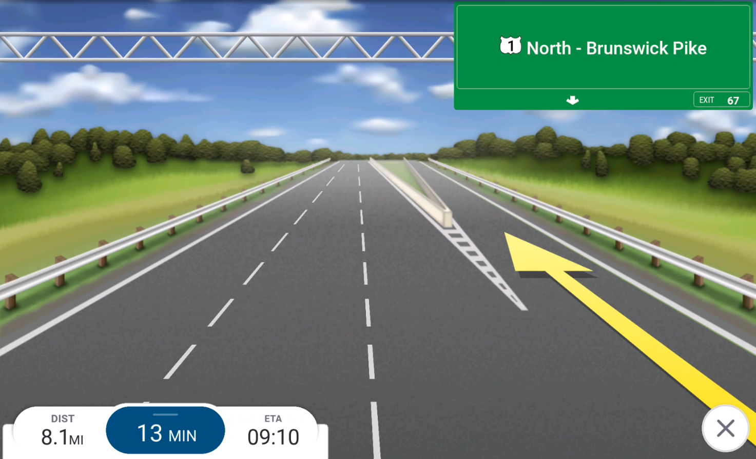 ClearTurn zeigt eine realistische Ansicht der bevorstehenden Abbiegung mit Spuranzeigepfeilen und Wegweisern an wichtigen Kreuzungen und Ausfahrten. Es ersetzt vorübergehend die Navigationsansicht und hilft dem Fahrer, die richtige Spur für eine bevorstehende Abbiegung zu wählen. (Siehe Videodemo unten.)