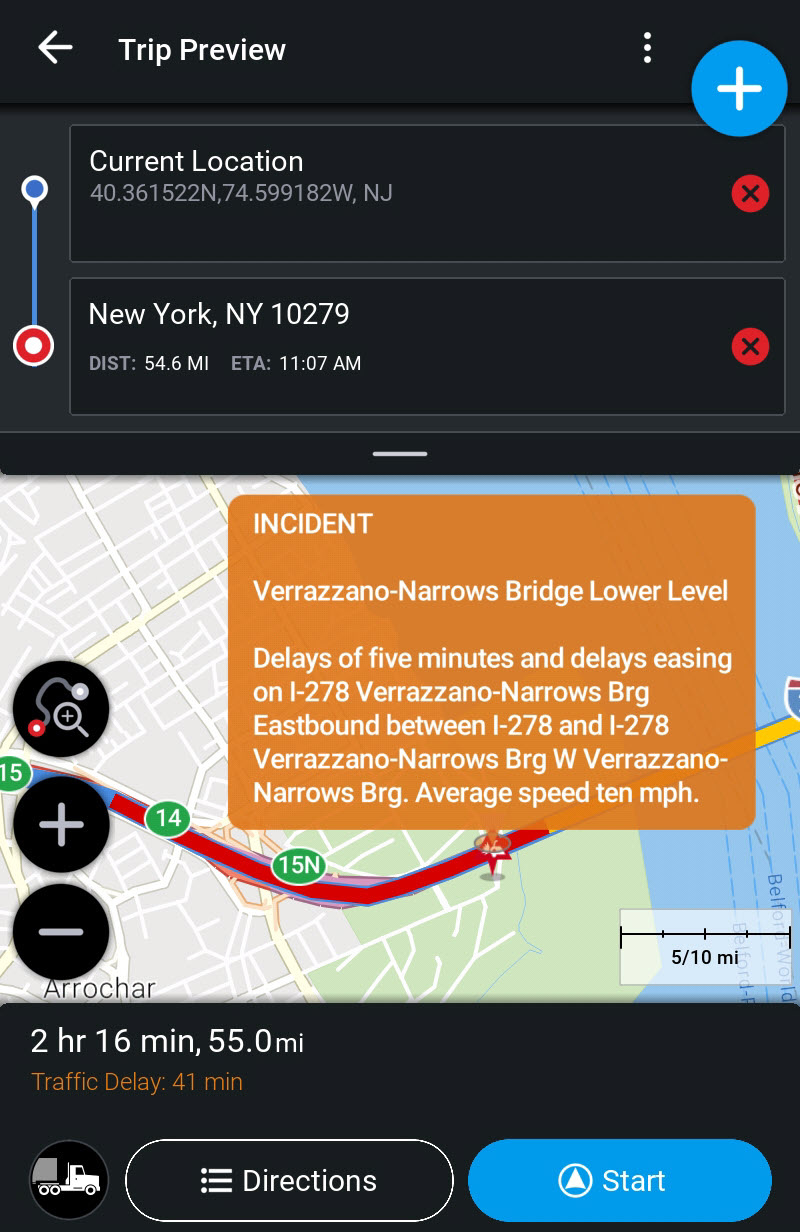 Wenn auf Ihrer Route eine Verkehrsstörung aufgetreten ist, zeigt CoPilot ein Symbol auf der Karte an, auf das Sie tippen können, um weitere Informationen zu erhalten. Die Symbole für Verkehrsstörungen sind während der Planung auf dem Bildschirm Routenvorschau und während der Fahrt auf dem Navigationsbildschirm zu sehen.