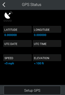 - Tippen Sie im Menü Optionen auf GPS. Wenn ein GPS-Signal empfangen wird, werden auf dem Bildschirm GPS-Status Ihr aktueller Standort, Datum, Uhrzeit, Geschwindigkeit und Höhe angezeigt. Wenn nicht, werden in den Feldern keine Daten angezeigt.