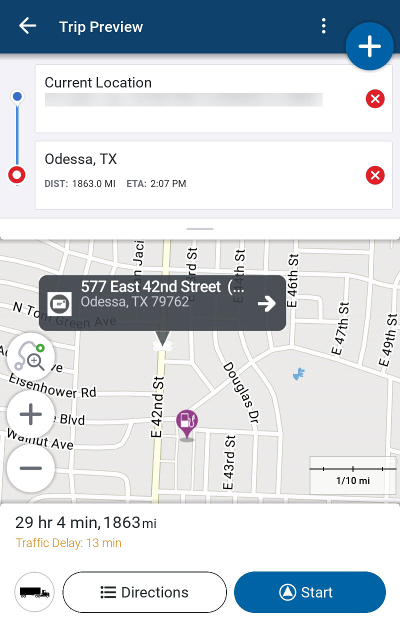 - Verwenden Sie auf dem Startbildschirm- oder Rutenvorschau-Bildschirm Fingerbewegungen, um zu der Position auf der Karte zu schwenken und zu zoomen, an der Sie einen Zwischenstopp hinzufügen möchten.