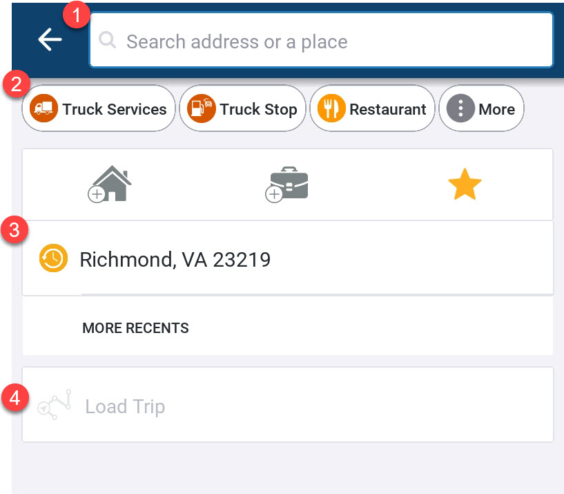 - In the Location Search screen, you can tap in the Search bar to search by address or Place name (1); tap one of the Places buttons to search for nearby Places by category (2); tap a recently searched location (3); or tap Load Trip (4) to load a saved trip.