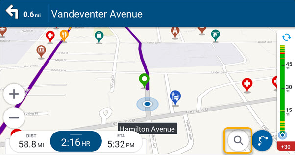 - Tap one of the Places buttons to search for nearby Places by category (Truck Services, Truck Stop, Restaurant, and More).