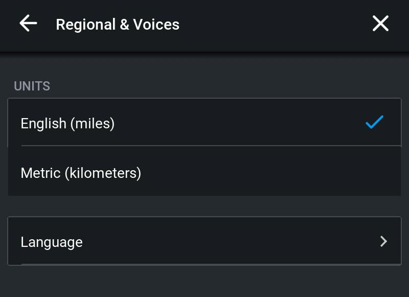 Regional & Voices settings allow you to select the distance units (miles or kilometers), as well as the language and voice used in displays, guidance, and warnings.