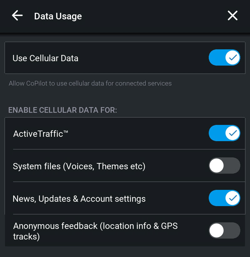 On the Data Usage screen, tap Use Cellular Data to switch off/on the ability to use cellular data for CoPilot services that require a data connection. If WiFi is available, CoPilot will use this connection as a preference.