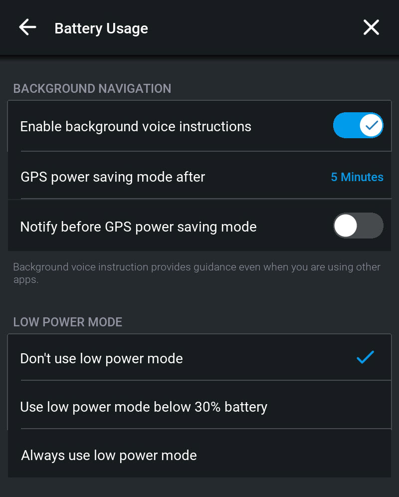 - Tap Enable background voice instructions to switch off/on having voice instructions continue even when you are using other apps.