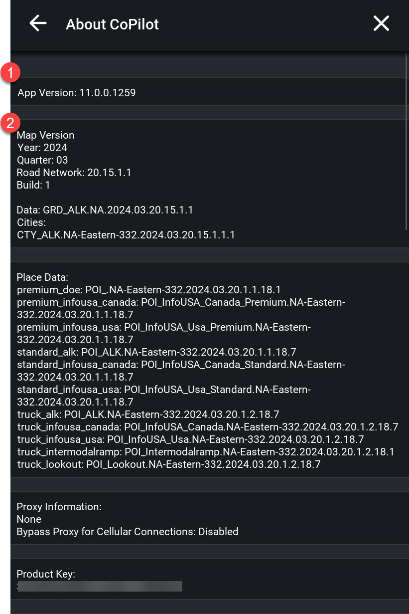 On the About CoPilot screen, you can check your current App Version (1) and Map Version (2) to be sure your app is up to date.
