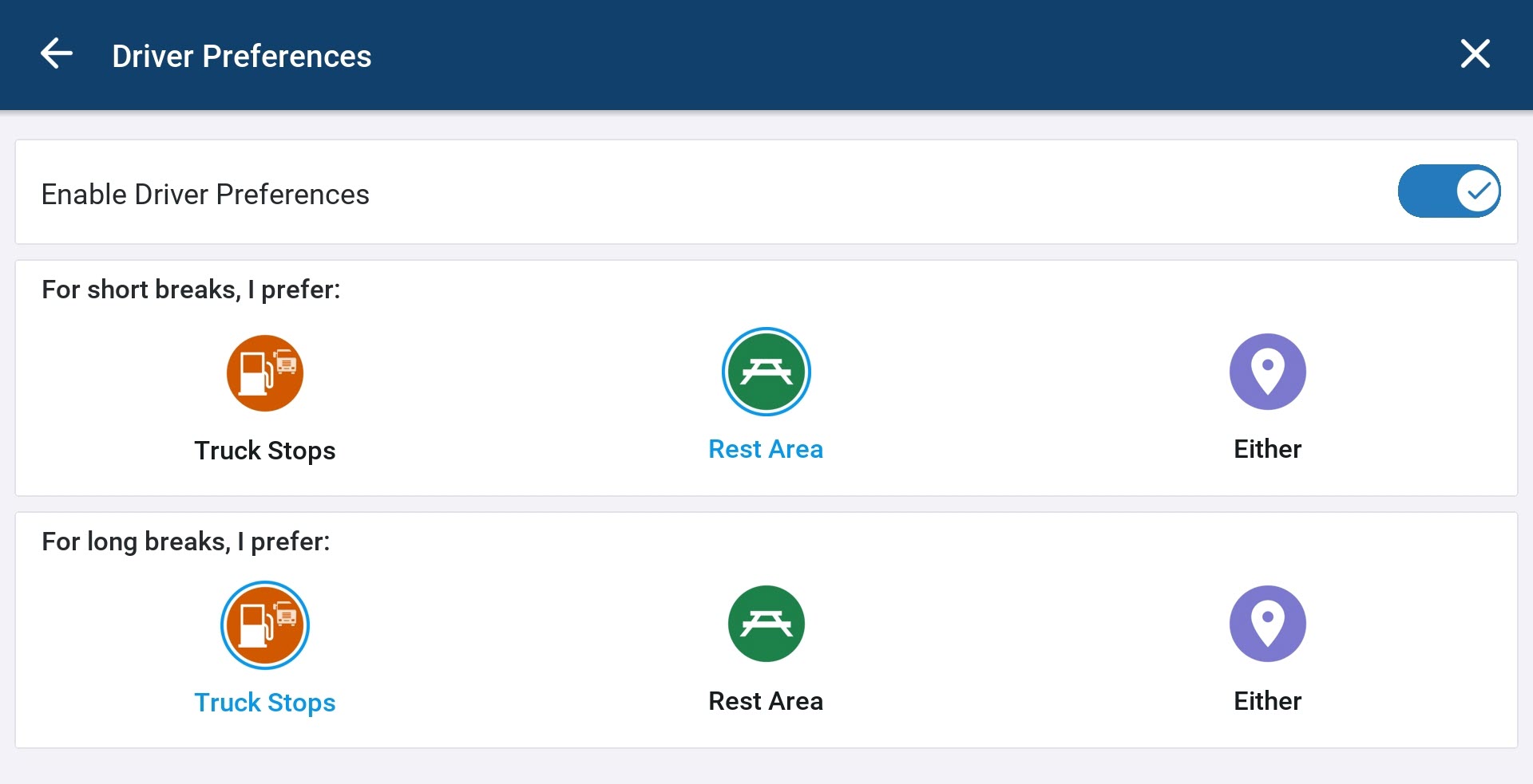 - Select the type of stop you prefer for short breaks and for long breaks.