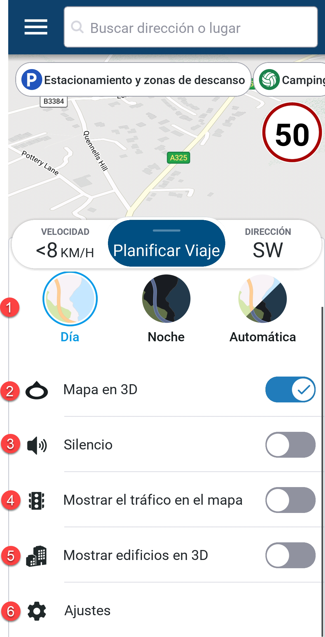 Para cambiar la configuración del mapa, toca la barra en la parte superior del botón Planificar Viaje en la parte inferior de la pantalla.