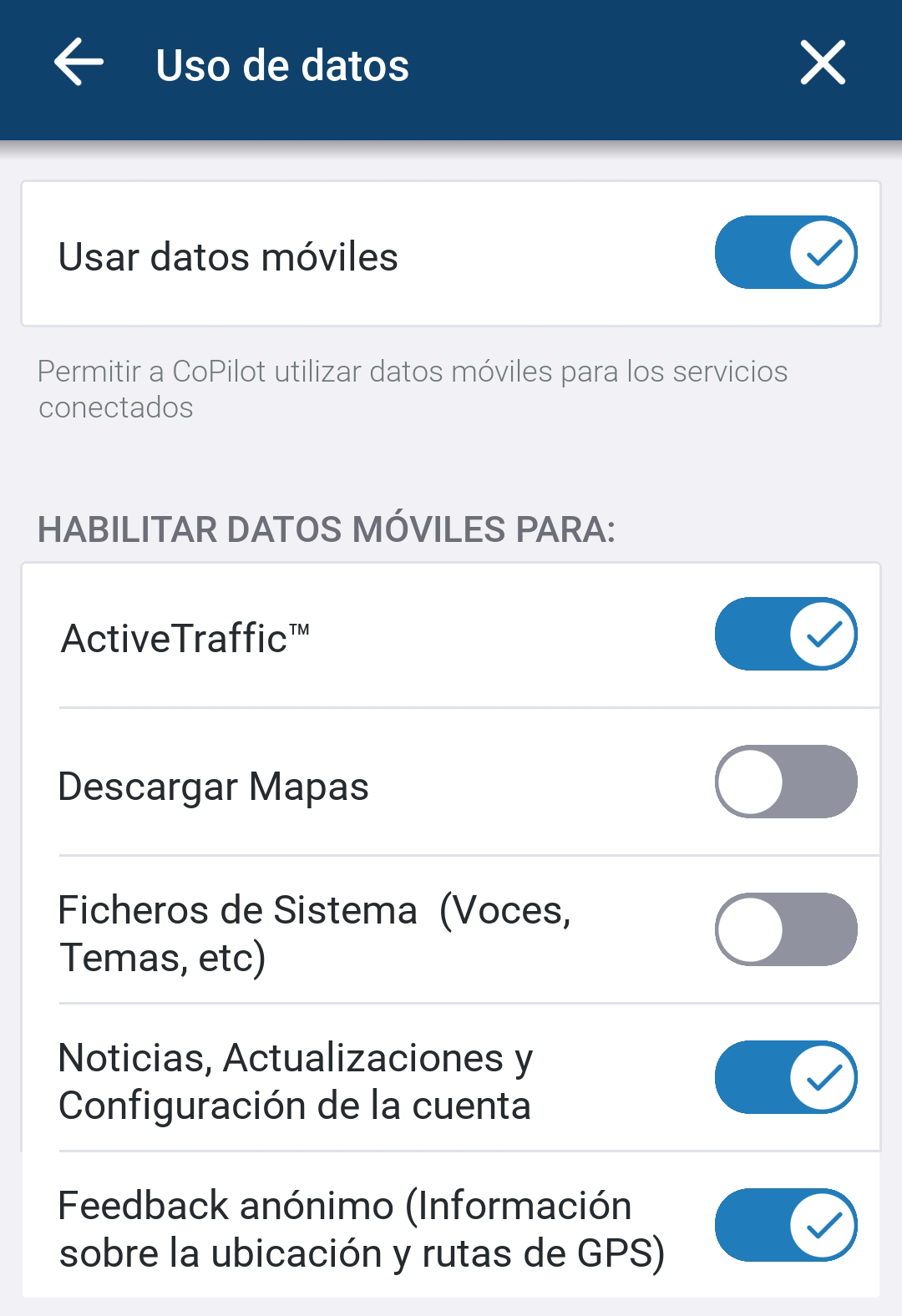 En la pantalla de Uso de Datos, toca Usar Datos Móviles para activar/desactivar la capacidad de usar datos móviles para los servicios de CoPilot que requieren una conexión de datos. Si WiFi está disponible, CoPilot usará esta conexión como preferencia.