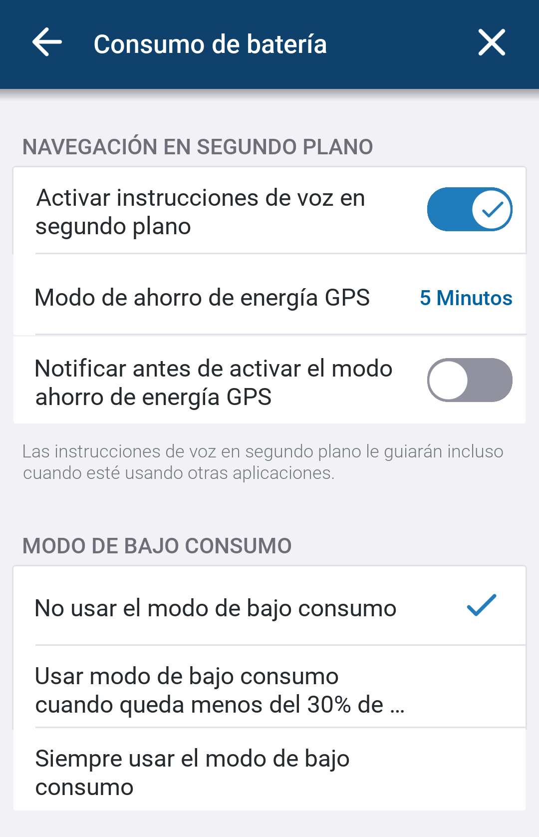 Puedes controlar qué funciones de CoPilot usan datos móviles y cambiar las opciones de ahorro de energía de la aplicación. Ambos conjuntos de controles están disponibles en la pantalla de Datos y Batería.