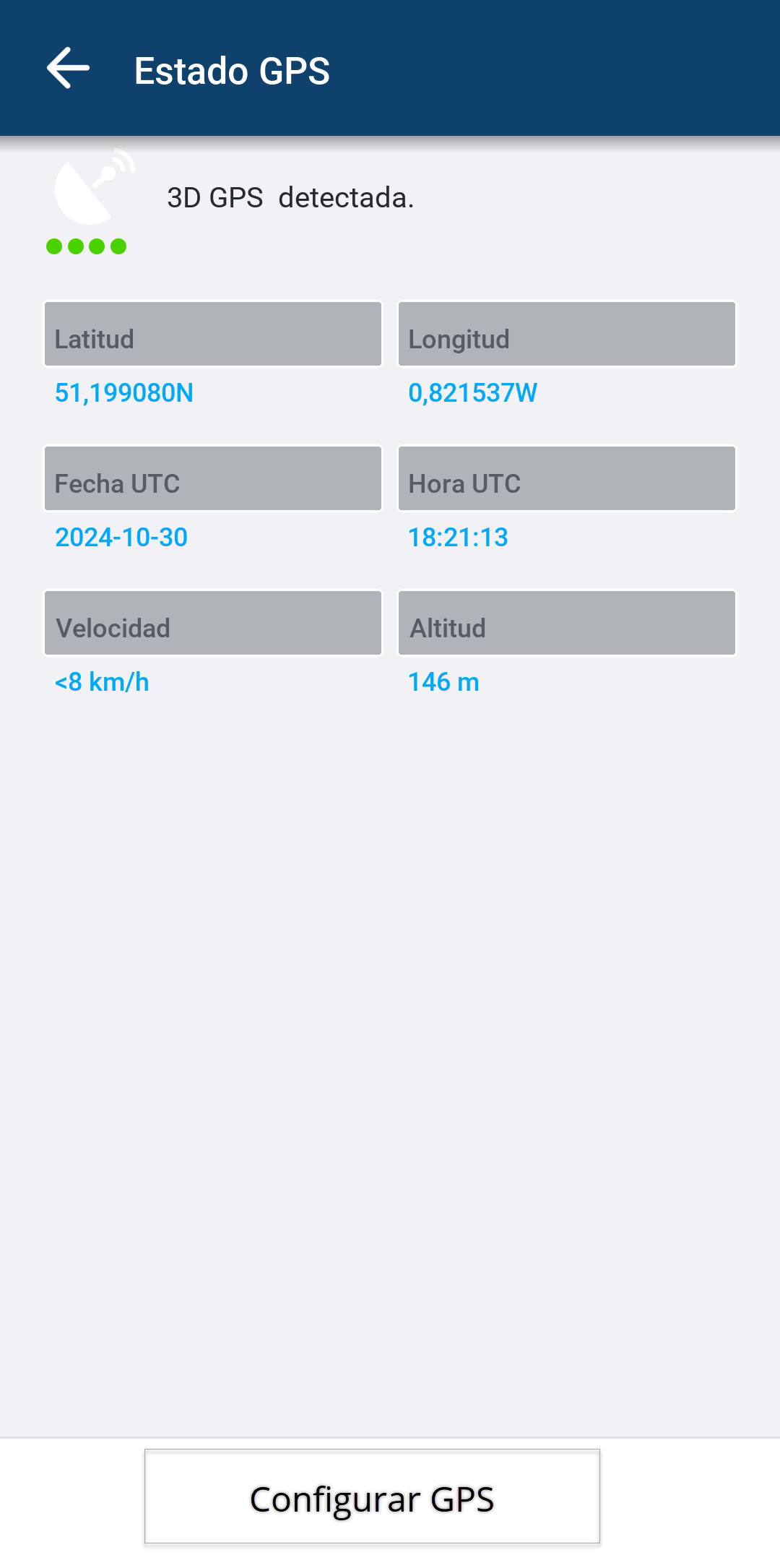 - Depuis le menu de Configuration, appuyez sur GPS. Si un signal GPS est reçu, l'écran d'État du GPS affichera votre position actuelle, la date, l'heure, la vitesse et l'altitude. Sinon, les champs ne montreront aucune donnée.