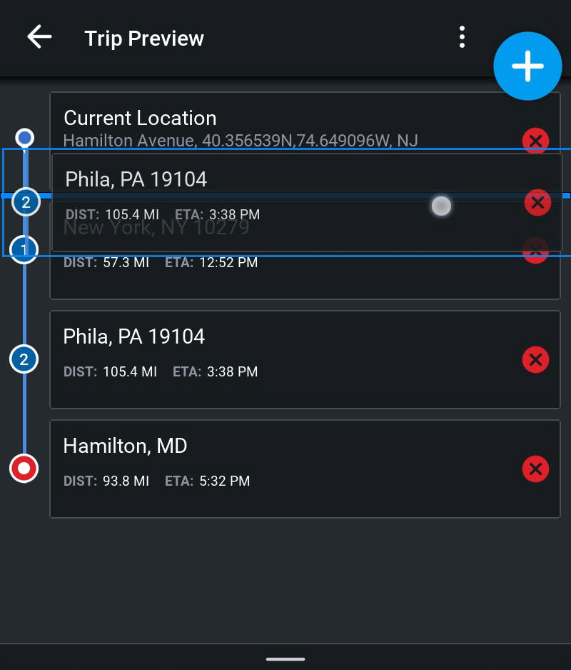 Bien qu'il soit généralement préférable de laisser CoPilot optimiser automatiquement l'itinéraire entier, vous pouvez souhaiter optimiser seulement une partie de l'itinéraire. Vous pouvez le faire, par exemple, en changeant l'ordre de deux des arrêts.