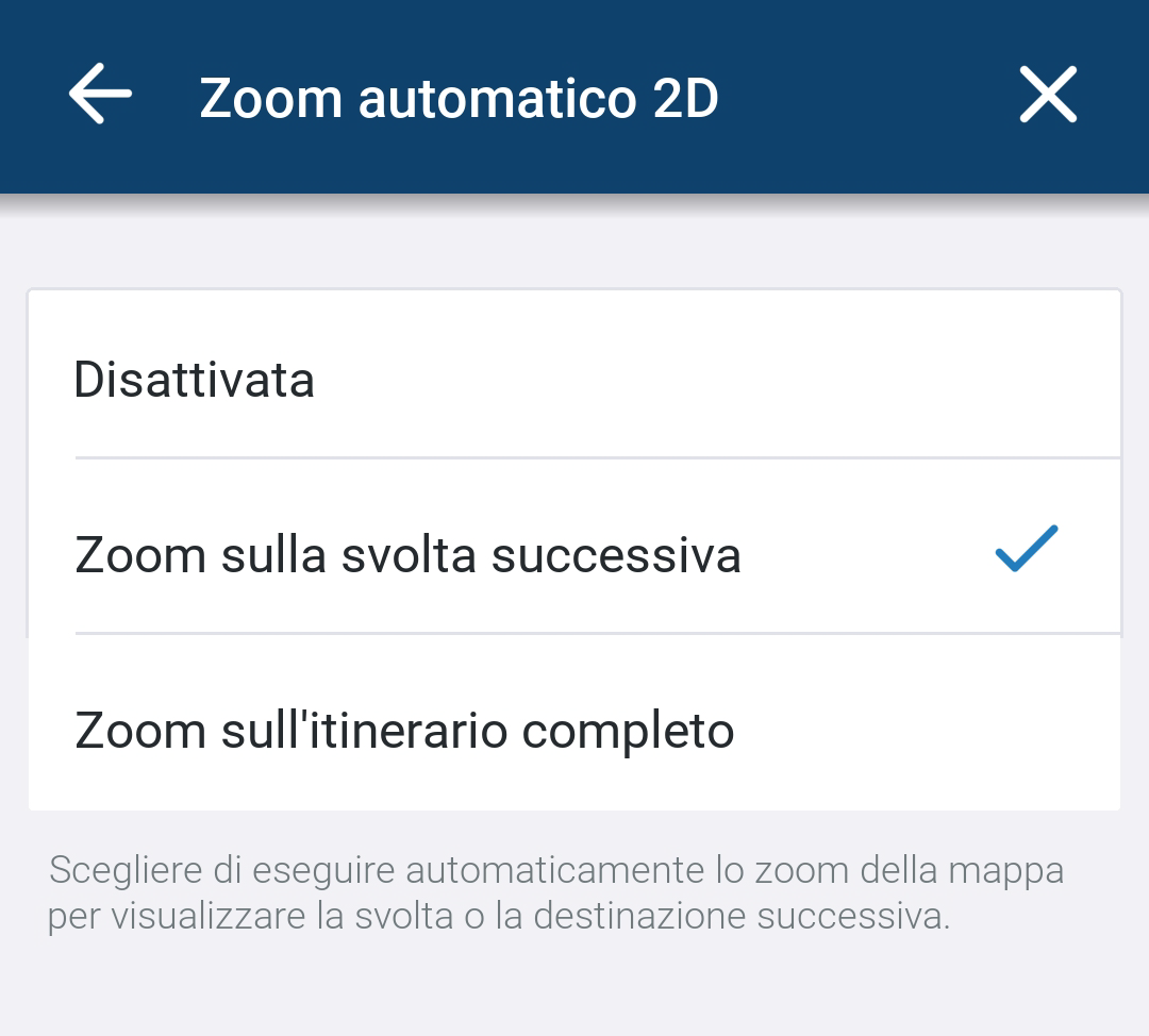 Quando è attivato, se stai usando la mappa 2D durante la navigazione, la mappa zoomerà gradualmente verso la tua prossima svolta mentre ti avvicini.
