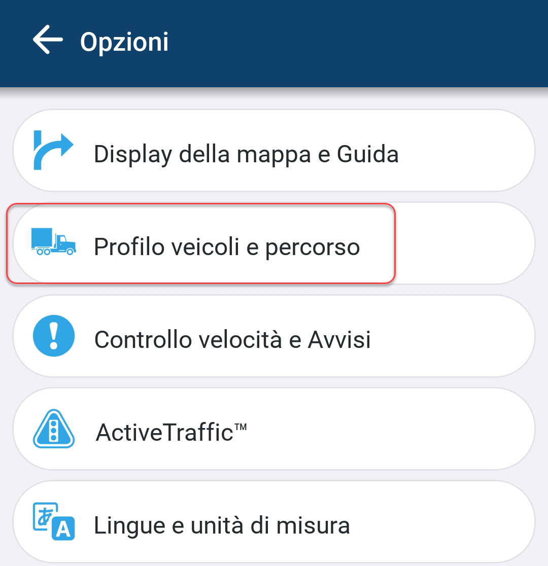 - Vai a Menu Principale >Opzioni > Profili veicoli e percorso.