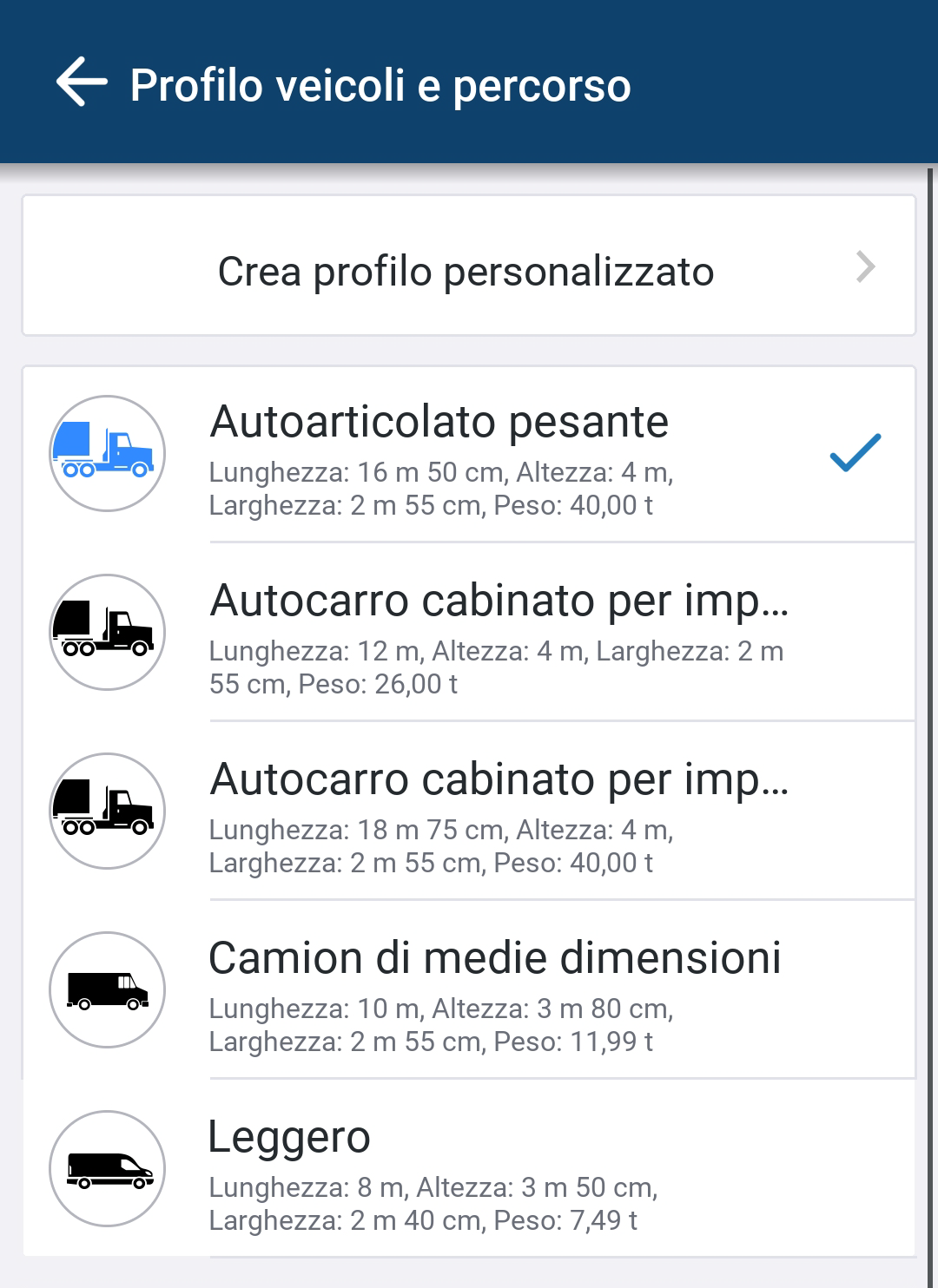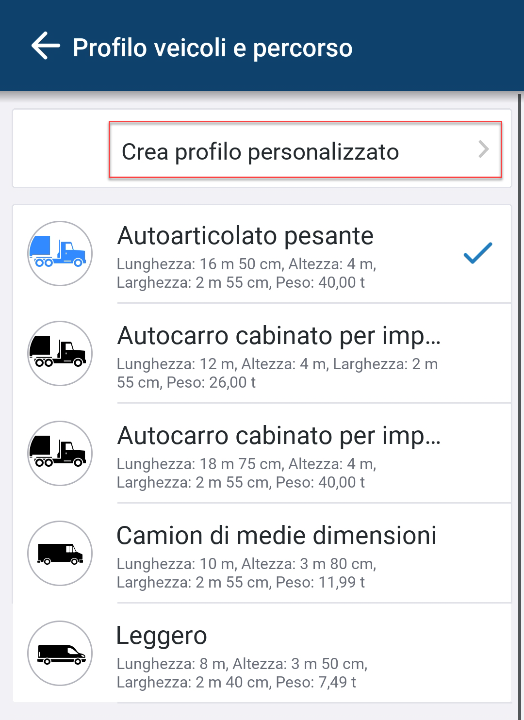 Se hai già selezionato un profilo di routing del veicolo ma desideri crearne uno nuovo, tocca Crea Profilo Personalizzato nella parte superiore della schermata Profili di Routing del Veicolo.