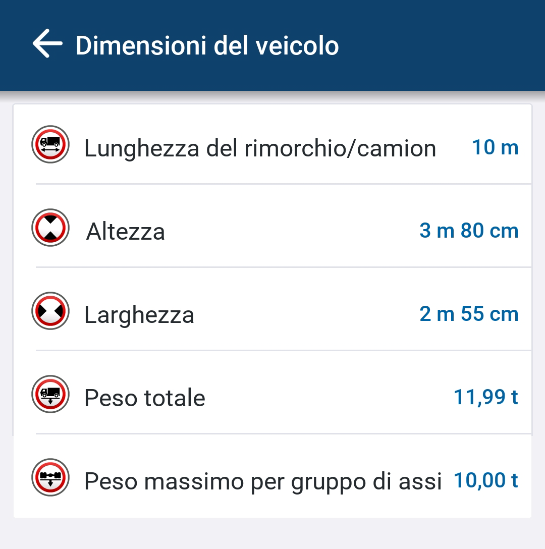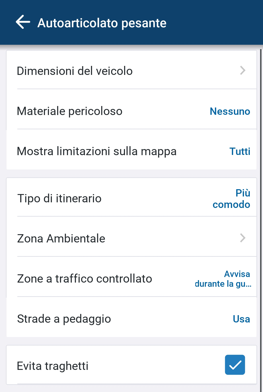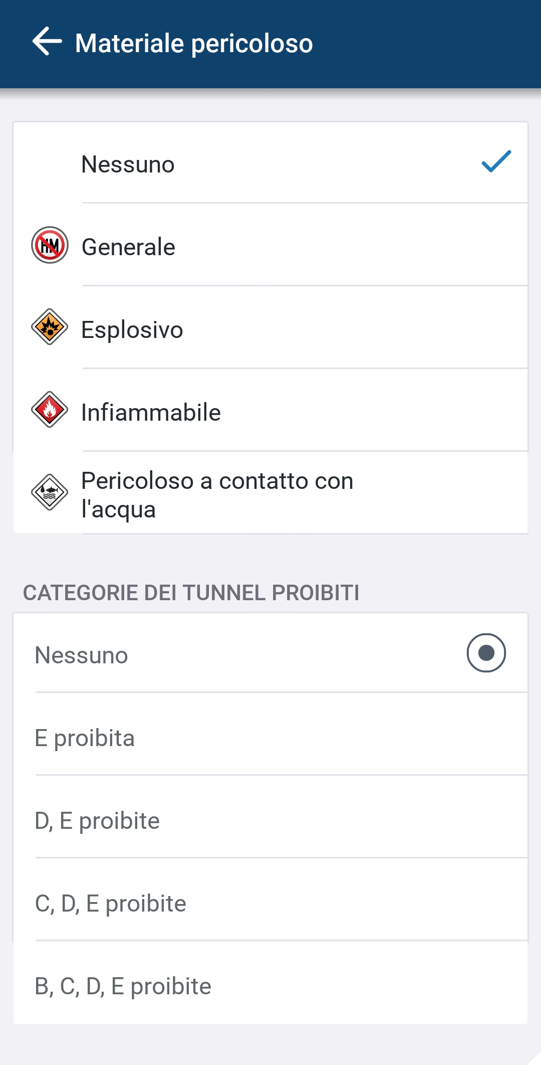 Se trasporti materiali pericolosi, potresti inoltre essere in grado di specificare quali categorie di tunnel il tuo camion è proibito entrare. (Solo in alcune regioni)