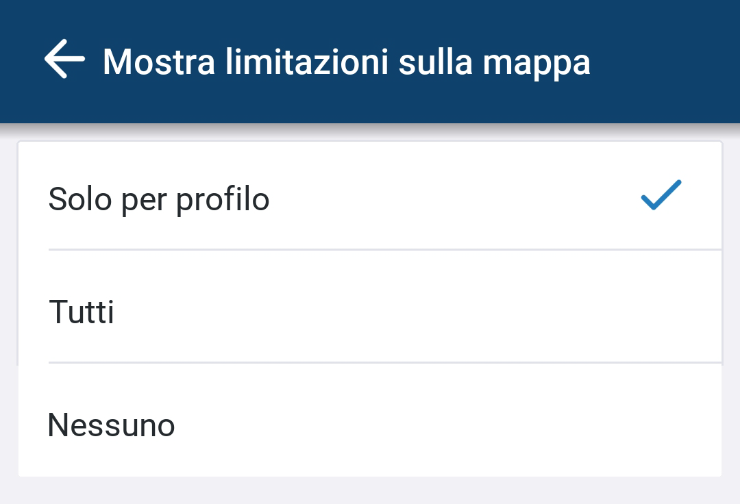 Ciò significa che, ad esempio, se una strada ha una restrizione di altezza, ma l'altezza massima impostata nel tuo profilo del veicolo è inferiore a quella altezza, la restrizione non verrà visualizzata sulla mappa.