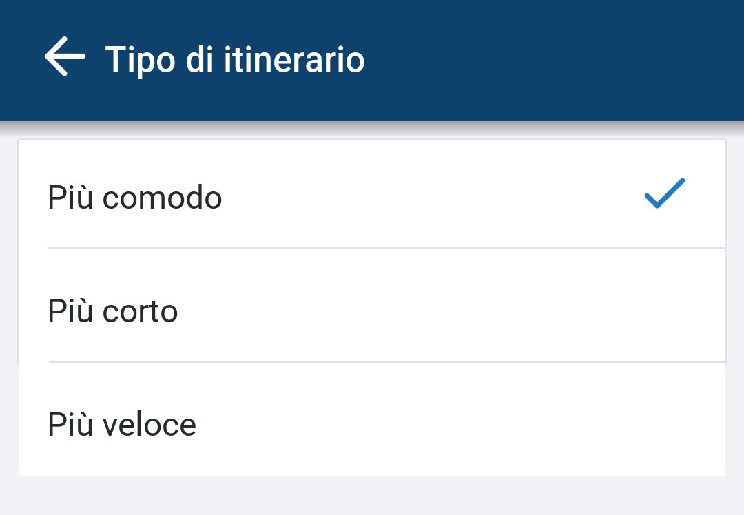 Il Tipo di itinerario ti permette di specificare il tipo di percorsi che desideri che CoPilot calcoli. A seconda del tipo di veicolo che hai selezionato, puoi scegliere tra tre modi per CoPilot di calcolare i percorsi: Pratico, Più Breve o Più Veloce. (Più Veloce non è raccomandato per i profili dei camion.)