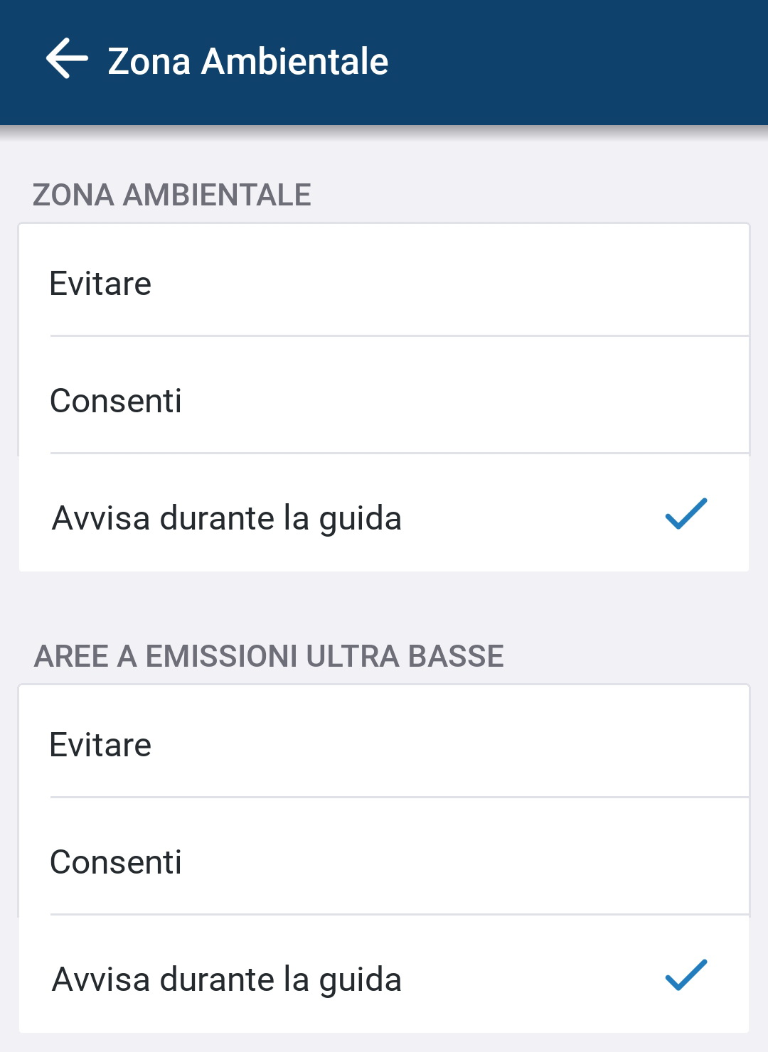 CoPilot calcolerà, dove possibile, percorsi che evitano zone ambientali o di congestione. Fornirà un avviso se il percorso deve entrare nella zona.