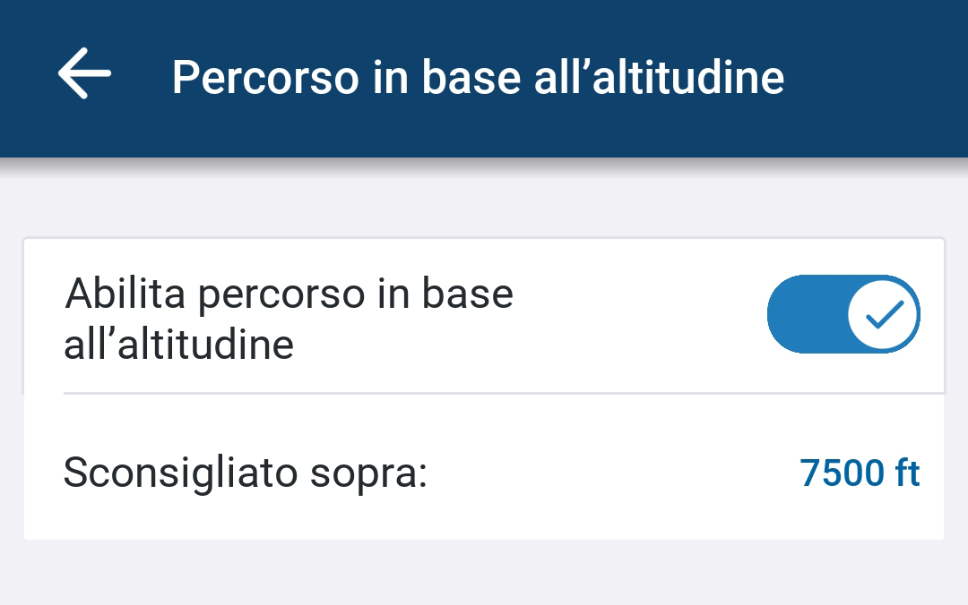 Il Routing in Elevazione imposta un limite personalizzato sull'elevazione delle strade che CoPilot utilizzerà quando genera un percorso. Le elevazioni a o sopra questa altezza verranno evitate su un percorso a meno che 1) non sia estremamente poco pratico farlo; o 2) una fermata o destinazione sul percorso si trovi a un'elevazione più alta.