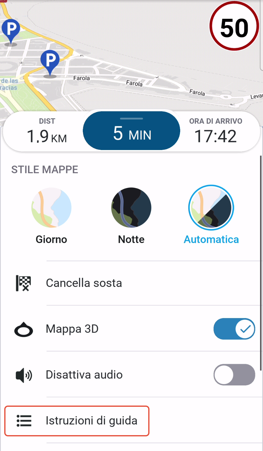 - Tocca la freccia nella parte superiore della schermata delle Indicazioni per chiuderla e tornare alla schermata di navigazione.