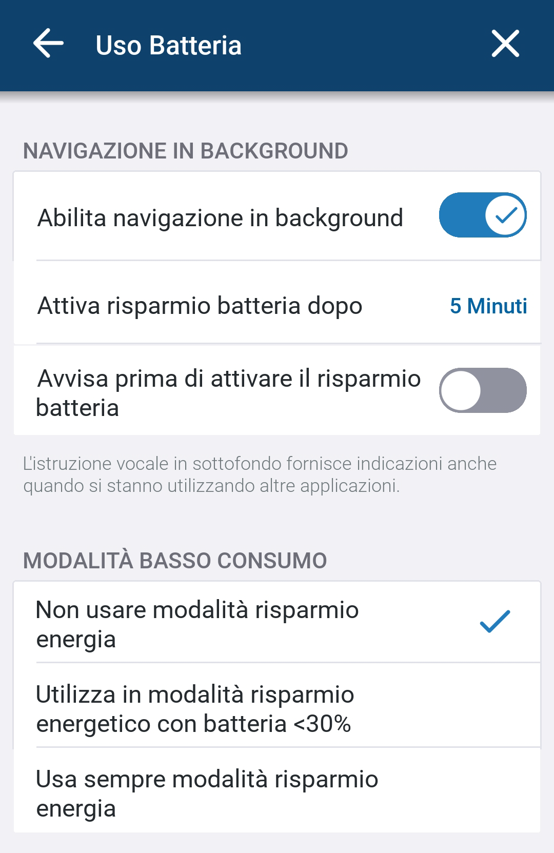 - Tocca Abilita navigazione in background per attivare/disattivare le istruzioni vocali che continuano anche quando stai utilizzando altre app.