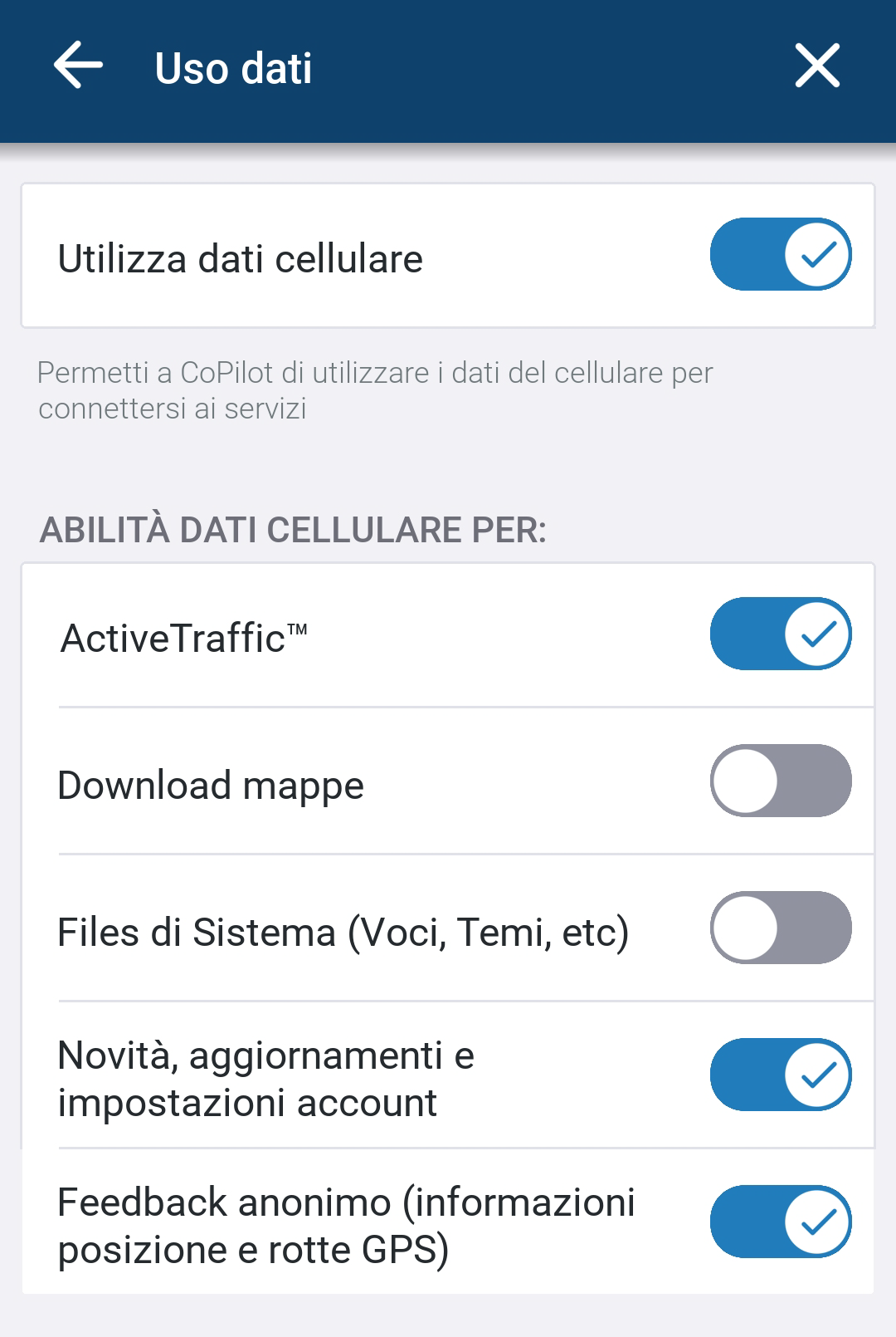 Nella schermata Utilizzo dei Dati, tocca Usa dati cellulare per attivare/disattivare la capacità di utilizzare i dati cellulari per i servizi di CoPilot che richiedono una connessione dati. Se è disponibile il WiFi, CoPilot utilizzerà questa connessione come preferenza.