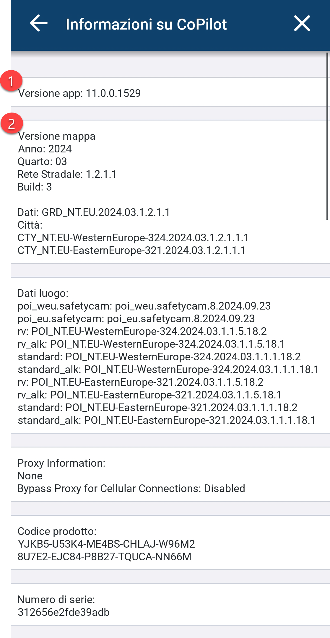 Nella schermata Informazioni su CoPilot, puoi controllare la tua Versione dell'App corrente (1) e la Versione della Mappa (2) per assicurarti che la tua app sia aggiornata.