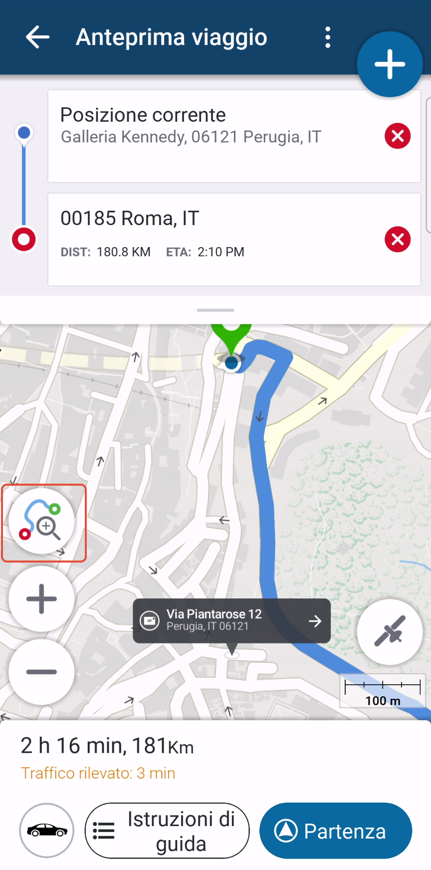 - Nella schermata Home o Anteprima Viaggio, usa i gesti delle dita per spostarti e zoomare sulla posizione sulla mappa dove desideri aggiungere una fermata. Suggerimento: puoi usare l'icona per zoomare direttamente sulla destinazione e sul punto di partenza in modo da inquadrare i rispettivi dintorni.