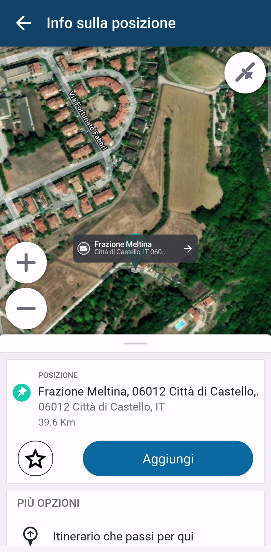 - Tocca la località che corrisponde meglio alla tua ricerca. Si apre la schermata Informazioni sulla Località. (In questo esempio, le mappe satellitari sono attivate.)