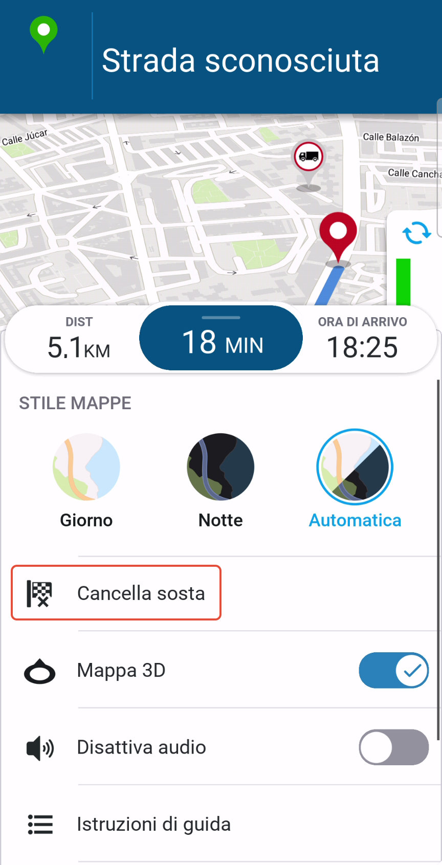 - Si apre il cassetto della schermata di navigazione. Tocca Cancella Sosta.